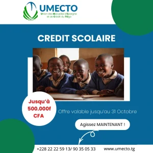 La réussite de vos enfants est aussi la nôtre. Ne laissez pas les contraintes financières freiner leurs ambitions. Passez dès aujourd’hui dans l’agence UMECTO la plus proche ou appelez nous au  (+228) 22 22 59 13 / 90 35 05 33 et profitez de notre offre de crédit scolaire avant fin octobre.